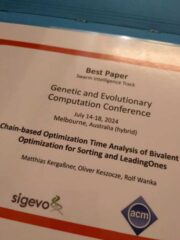 Matthias Kergaßner, Oliver Keszöcze, and Rolf Wanka from the Chair of Computer Science 12 received for their contribution Markov Chain-based Optimization Time Analysis of Bivalent Ant Colony Optimization for Sorting and LeadingOnes the award for the best paper in the category Swarm Intelligence at this year’s Genetic and Evolutionary Computation Conference (GECCO).